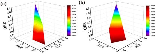 Response surface plot illustrating the effects of KER and PER on QER. (a) The perilla ketone concentration was 3% (w/v). (b) The perilla ketone concentration was 5% (w/v). (QER: quantitative enhancement ratio; PER: enhancement ratio of the drug permeability coefficient; KER: partition enhancement ratio for drug distribution to the stratum corneum).