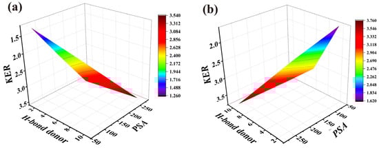 Equations (9) and (10) demonstrate that the KER value is positively correlated with the PSA and H-bond donor number of the drug. The regression curves are presented in Figure 8. These findings suggest that the formation of intermolecular H-bonds plays a crucial role in the ability of the penetration enhancer to promote the drug’s distribution from the solution to the SC []. When the number of H-bond donors in the drug’s molecular structure increased, its ability to form intermolecular H-bonds was enhanced, making the process of distribution from the solution to the SC more sensitive to regulation by PEK. This could be attributed to the fact that PEK contains only H-bond acceptors; PEK can act as an H-bond receptor, forming complexes with the drugs. This interaction reduces the overall polarity of the complex and facilitates the drug’s distribution into the SC []. For instance, rutin, which contains 10 H-bond donors in its structure and has the highest number of H-bond donors among the model drugs, exhibited the highest KER value.