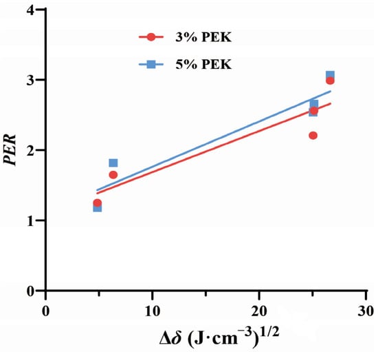 The analysis of the relationship between the PER value and the physicochemical properties of the drugs showed a positive correlation between the PER value and the difference in solubility parameters (∆δ) between the model drug and NP. The regression equation for PEK at a concentration of 3% (w/v) was as follows:
