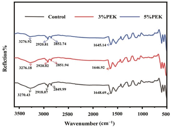 ATR-FTIR spectroscopy was used to assess changes in the organization of skin lipids following the addition of PEK []. The rat skin was mounted between two vertical diffusion chambers. A 200 μL sample of the donor solution was applied to the SC side, while 4 mL of PBS was used as the receptor medium. After 4 h, the skin was removed from the diffusion cell, and its surface was gently wiped with cotton. The skin was then positioned with the SC side facing down on a ZnSe crystal and analyzed in the wavenumber range of 4000–400 cm−1 using an IR spectrometer (NEXUS + 70, Thermo Electron Corporation, Waltham, MA, USA).