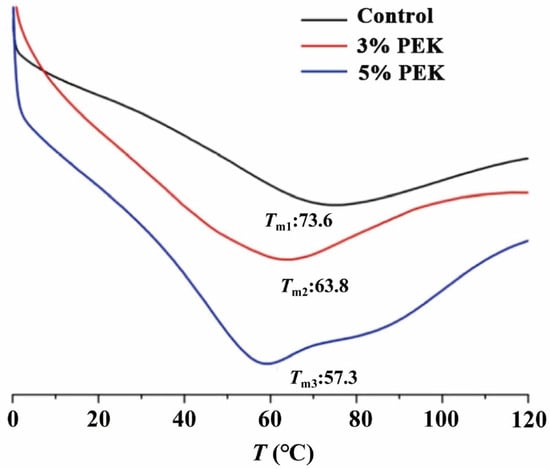 The skin treatment procedure followed the method outlined in Section 2.5. The SC was immersed in an ethanol solution containing varying concentrations of PEK at room temperature for 0.5 h, after which the ethanol was removed through vacuum drying. A 5 mg piece of the SC (either treated or untreated) was cut into small segments and placed in an aluminum pan. All the samples were analyzed using a Mettler-Toledo thermal analyzer (DSC1, Mettler-Toledo International Inc., Zurich, Switzerland) with a temperature range of 0–120 °C and a heating rate of 5 °C·min−1 under nitrogen flow [].