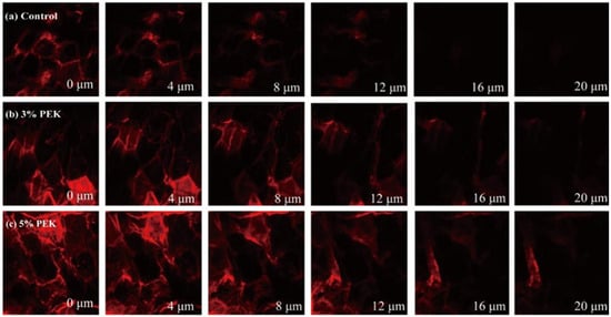 CLSM was used to visualize the skin enhancement effect of PEK, using FITC as the fluorescent probe. FITC and PEK were mixed into IPP and sonicated until the FITC was completely dissolved. The supernatant was used as the donor solution, and FITC in IPP without PEK was used for the control group. The rat skin was mounted between two vertical diffusion chambers, and the prepared solution was applied to the skin for 4 h. Afterward, the skin was rinsed with distilled water and gently dried with filter paper to remove the excess solution on its surface []. The skin was then placed on a glass slide, and CLSM analysis was conducted using an LSM 710 Laser Scan Microscope (Carl Zeiss AG, Jena, Germany). The excitation wavelength was set to 520 nm, with a scanning depth of 0–20 μm and a step length of 4 μm.