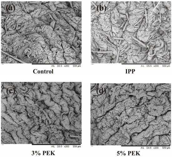 An SEM was used to monitor the morphological changes in the skin []. The surface of the normal rat skin’s SC appeared relatively flat, with minimal folds, hair, and skin appendages. The keratinocytes were arranged in a regular, neat, and tightly stacked layered structure, contributing to the skin’s barrier function, as shown in Figure 14a. The changes in the microstructure of the rat skin’s SC after treatment are depicted in Figure 14b–d. Compared with that for normal skin, the SC in the solvent IPP group showed no significant changes, maintaining a layered and ordered stacking arrangement. However, in the 3% (w/v) PEK-treated group, a certain degree of loosening in the tightly stacked layers was observed, with significantly deeper and more pronounced folds on the surface and small amounts of keratinized scales flipping up. The effect was even more pronounced in the 5% (w/v) PEK-treated group, where small cracks and local shedding of the SC were observed. The loosening of the SC can be attributed to the lipid-disrupting effect of PEK, while the increase in skin wrinkles may result from hydration. The upward movement and shedding of keratin scales were likely due to the lipid extraction effect of PEK. SEM observations revealed the microscopic changes in the SC, supporting the hypothesis that PEK enhances the distribution and diffusion of drugs in the SC. Additionally, the concentration-dependent penetration enhancement effect of PEK on drugs was evident.