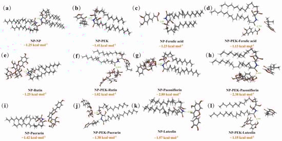 Snapshots of the optimal binding sites for hydrogen bonds between each group of molecules. (a) Binding site between NP and NP. (b) Binding site between NP and PEK. (c) Binding site between NP and ferulic acid. (d) Binding site between NP-PEK and ferulic acid. (e) Binding site between NP and rutin. (f) Binding site between NP-PEK and rutin. (g) Binding site between NP and paeoniflorin. (h) Binding site between NP-PEK and paeoniflorin. (i) Binding site between NP and puerarin. (j) Binding site between NP-PEK and puerarin. (k) Binding site between NP and luteolin. (l) Binding site between NP-PEK and luteolin. (Gray: carbon; red: oxygen; blue: nitrogen; white: hydrogen. H-bonds are presented as light green dotted lines; H-bond energy values are described in orange letters; NP: ceramide NP; PEK: perilla ketone).
