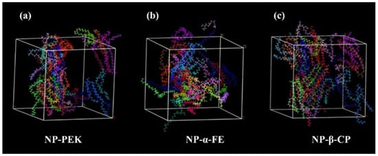MD was used to investigate the interaction between the model drugs, PEK, and NP. This study used Materials Studio version 7.0 software (Accelrys Inc., San Diego, CA, USA) []. The chemical structures of the compounds were optimized using the Forcite module, and MD was performed in the Blend module. The lowest energy conformation of the mixture under the COMPASS II force field was calculated, and the docking energy was determined using the Dreiding force field [].