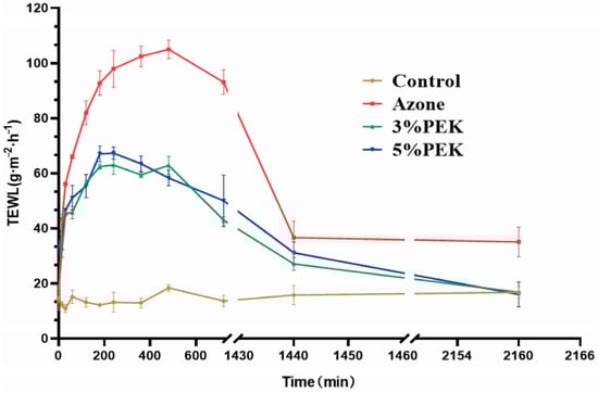 The moisture loss from the surface of the skin is closely linked to its barrier function, and the extent of this loss serves as an indicator of changes in skin barrier integrity []. The variations in TEWL are depicted in Figure 17. Throughout the experiment, the TEWL values in the control group remained consistent across all the detection time points. However, after the administration of penetration enhancers for 5 min, the TEWL values of the 3% (w/v) PEK group, 5% (w/v) PEK group, and azone group significantly increased compared with those of the control group (p < 0.05). This indicates that the application of penetration enhancers can rapidly impair the skin’s barrier function, leading to an increase in water loss from the skin.
