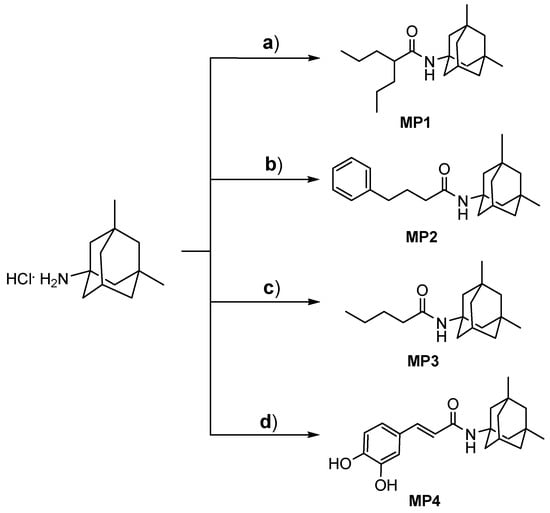 In our previous study, MP1–4 were designed and synthetized by employing the synthetic methods outlined in Figure 1 [4,6]. Briefly, ethylchloroformate was used as a reagent for amino group activation in amide linkage synthesis between memantine and the suitable carboxylic derivatives. MP1–4 were obtained in good yields (>50%, Supplementary Data S1).