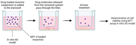In vitro BBB models were created using a transwell culture system for BBB permeability analysis. Initially, bEnd.3 cells were seeded inside the membrane of the plate at a starting density of 1 × 105 cells/well and cultured for about a week in DMEM growth medium supplemented with 10% fetal bovine serum. Subsequently, the upper compartments containing bEnd.3 monolayers were transferred to plates containing SH-SY5Y cells coated at the bottom of the lower compartments. Then, carrier particles were added to the apical upper chambers of the BBB models at a final concentration of 0.1 mg/mL. Approximately 24 h after incubation, viability analyses were conducted on the SH-SY5Y disease model formed in the lower layer to determine BBB permeability capacities [19]. A schematic diagram of the method is shown below (Figure 2). Prior to starting the experimental procedures, the bEnd.3 cells were cultured until 90–100% confluency was achieved, as this confluency level is necessary for tight junction formation and optimal barrier properties. The integrity of the cell monolayer was then evaluated under an inverted microscope to confirm confluence and uniform cell distribution, ensuring the reliability of the in vitro BBB model.