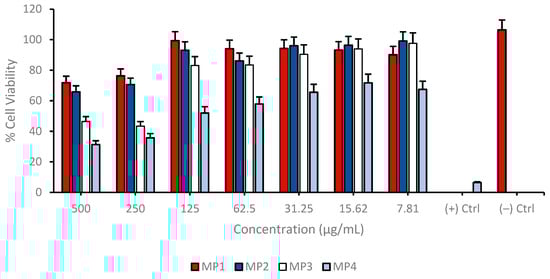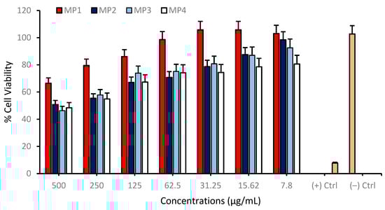 IC50 values (μg/mL) indicate the concentration required to achieve 50% cell viability for MP1–4 compounds.