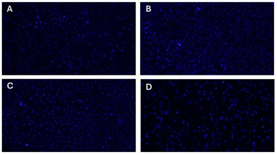 The human fibroblast cell line (ATCC® PCS-201-012™ Manassas, VA, USA) was propagated in DMEM culture medium enriched with a 1% mixture of penicillin/streptomycin antibiotics and 10% fetal bovine serum (FBS) and maintained in an atmosphere containing 5% CO2 at a temperature of 37 °C until they reached full confluence. To identify nuclei alterations, Hoechst 33258 fluorescent dye was employed. In this procedure, fibroblast cells underwent a 24 h treatment with various concentrations of drug formulations (ranging from 0 to 500 µg/mL, specifically at 8.62 µg/mL, 16.13 µg/mL, 31.25 µg/mL, 62.5 µg/mL, 125 µg/mL, 250 µg/mL, and 500 µg/mL) determined by the IC50 value for synthesized compounds. Following the treatment period, the cells were stabilized using 4% paraformaldehyde at a cool temperature of 4 °C for 30 min. The cells were then rinsed with PBS and exposed to 1 µM of the Hoechst 33258 dye for a brief duration of 5 min [15]. After the staining process, the cells were examined and imaged using a Leica® DM IL LED (Leica Microsystems, Wetzlar, DE) fluorescent microscope.
