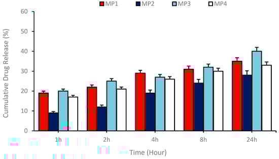 Drug release profile showing the release of MP1–4 drugs from niosomal carriers prepared by the thin film hydration technique at certain time intervals for 24 h.