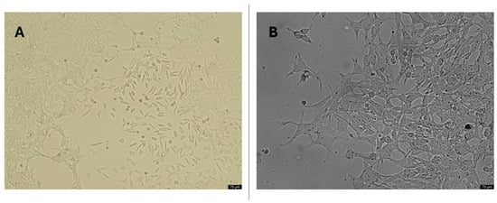 Morphological cell structures of differentiated SH-SY5Y cells. (A) 20× resolution of undifferentiated cell cultures; (B) 20× resolution of differentiated cell cultures (application of 10 µM all-trans RA to cell culture for 11 days).