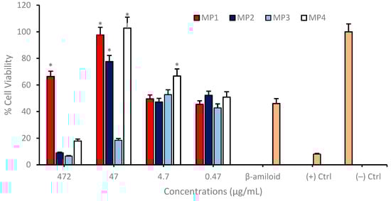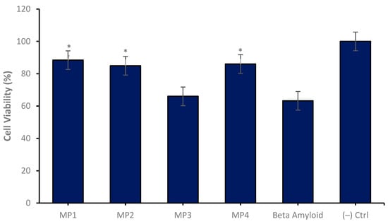 Neuroprotective properties of the MP1–4 (47 µg/mL) on the experimental AD model for 24 h of application. Group analyses were performed with the one-way ANOVA procedure, and comparisons were made using Dunnett’s test (against the amyloid beta application). The level of significance was set at 5% (p < 0.05). Significant differences compared to the control group are indicated by an asterisk (*).