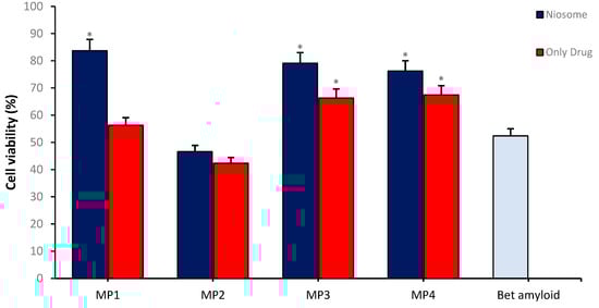 In the conducted in vitro studies, the neuroprotective effects of memantine derivatives encapsulated within a nanosomal drug delivery system were evaluated using the SH-SY5Y neuroblastoma cell line as a model for AD. The differentiated neuronal cultures were treated with memantine derivatives which were loaded into the niosomal drug delivery systems at a uniform concentration of 47 µg/mL across three independent experimental repeats. The outcomes demonstrated that certain memantine derivatives, most notably MP1, MP2 and MP4, conferred a significant degree of neuroprotection when compared to control cultures treated solely with amyloid beta. Notably, these derivatives augmented cell viability by approximately 40%, highlighting their potential utility as therapeutic agents (Figure 10).