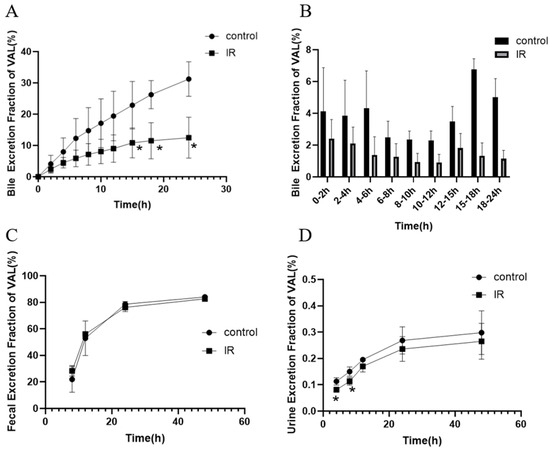 The cumulative excretion fraction of valsartan in bile (A), fecal (C), urine (D), and excretion fraction of valsartan in different time periods in bile (B) after abdominal irradiation with 5 Gy of X-rays (Mean ± SD, n = 4( A,B), n = 6 (C,D); * indicates the control group compared, * p < 0.05).