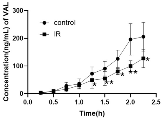 In order to exclude the influence of other factors in vivo, an in vitro inverted intestinal sac assay was designed to explore the role of intestine absorption. The in vitro absorption of the IR group exhibited a significant decrease (Figure 3), which was observed from 1.25 h onwards. The concentration of valsartan in the intestinal sac at the final time point was measured to be 127 ± 32.94 ng/mL in the IR group, demonstrating a significant reduction of 38% compared to that observed in the control group (205.6 ± 51.72 ng/mL). These findings strongly suggest that diminished absorption is primarily responsible for the decline in plasma concentration of valsartan.
