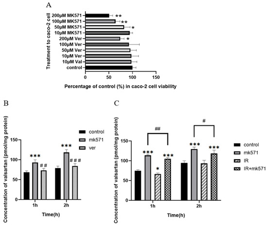 Percentage of Caco-2 viability after treatment with valsartan and inhibitors of Mrp2 and P-gp (A), concentration of valsartan in Caco-2 cells after treatment with valsartan and inhibitors of MK571 or Ver (B), and concentration of valsartan in Caco-2 cells after irradiation with 5 Gy of X-rays (C) (Mean ± SD, n = 4, * indicates the control group compared, # indicates the MK571 group compared, * p < 0.05, ** p < 0.01, *** p < 0.001, # p < 0.05, ## p < 0.01, ### p < 0.001).