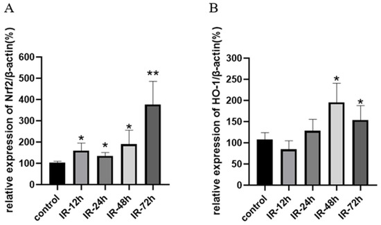 Nrf2 is a key transcription factor that regulates a variety of antioxidant enzymes or substances, including GSH, SOD, and CAT. HO-1 (heme oxygenase-1) is also an antioxidant enzyme regulated downstream of Nrf2 and plays an important role in scavenging ROS produced by oxidative stress [59]. The results of mRNA transcription of Nrf2 as well as HO-1 are shown in Figure 7. Compared with the control group, the mRNA expression of Nrf2 was significantly upregulated after irradiation (p < 0.05) and showed a time-dependent manner in general. The expression of HO-1 was significantly increased at 48 h and 72 h after irradiation (p < 0.05), which indirectly proves the regulatory role of Nrf2 upregulation on downstream genes.
