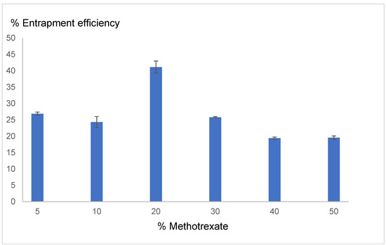 Figure 1. Effect of the methotrexate concentration (% per lipid weight) on the % entrapment efficiency (). Each value represents the mean ± standard deviation (n = 3).