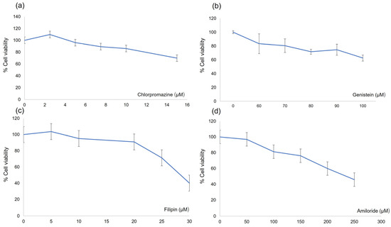 Figure 2. In vitro cytotoxicity test of endocytosis inhibitors. (a) chlorpromazine, (b) genistein, (c) filipin and (d) amiloride. Each value represents the mean ± standard deviation (n = 3).