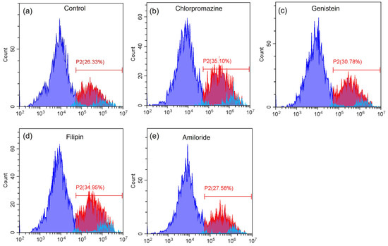 The fluorescence histograms obtained by flow cytometry of the control and all the specific inhibitors are shown in Figure 3. The percentage of cellular uptake of rhodamine DHPE-labeled liposomes with 1% glycocholic acid as a control and endocytosis inhibitor was 30.24–36.28%, as shown in Table 5. There was no significant difference among the control and cells treated with each specific inhibitor.