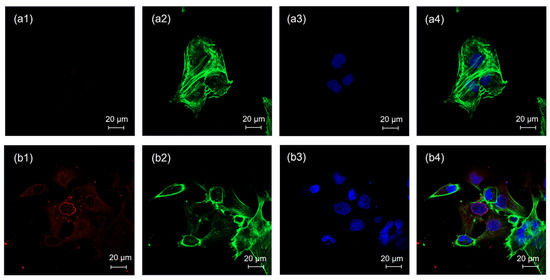 Figure 4. CLSM images of HBEC-5i cells treated with (a) the negative control and (b) the positive control; (1) the red fluorescence of rhodamine DHPE, (2) the green fluorescence of Alexa Fluor™ 488 phalloidin, (3) the blue fluorescence of DAPI, and (4) merged images. Each scale bar represents 20 µm.