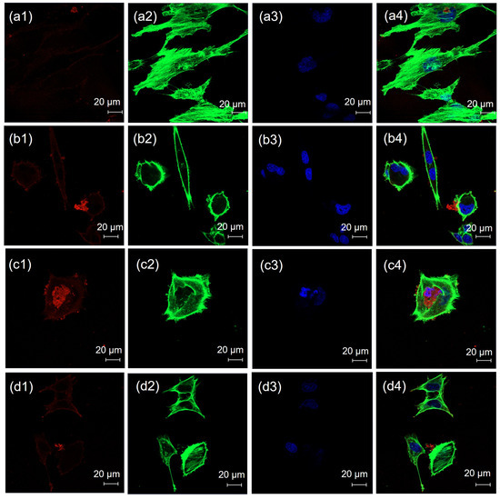 Figure 5. CLSM images of HBEC-5i cells treated with (a) chlorpromazine, (b) genistein, (c) filipin and (d) amiloride; (1) red fluorescence of rhodamine DHPE; (2) green fluorescence of Alexa Fluor™ 488 phalloidin; (3) blue fluorescence of DAPI; and (4) merged images. Each scale bar represents 20 µm.