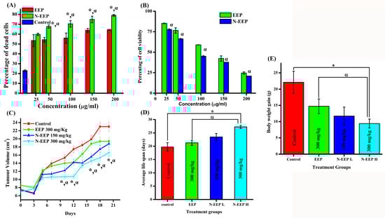 (A) Percentage of cell death after short-term toxicity analysis on DLA cells using trypan blue staining; (B) cell viability assessment using MTT analysis on DLA cells; (C) effect of EEP and N-EEP on tumor growth monitored by the increase in tumor volume with time; (D) average life span; and (E) body weight gain of the animals induced with DLA tumor and DLA tumor treated with EEP and N-EEP. (*—p < 0.01, in comparison with untreated control; α—p < 0.01, in comparison with the EEP treatment group at the same dose).