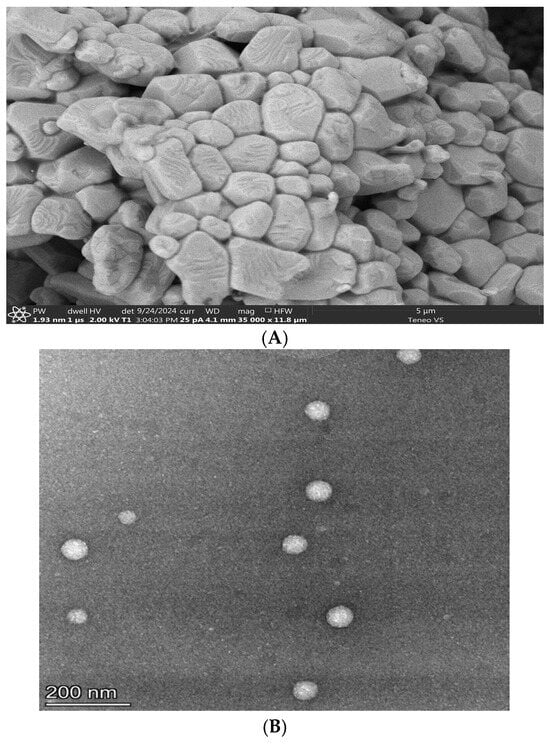 SEM analysis was performed at the George Washington University (GW) Nanofabrication and Imaging Center. To determine the size of the particles, all lyophilized compounds were mounted on aluminum stubs using carbon tape for SEM analysis. Imaging was performed using an in-lens FEI Teneo FEG SEM (Thermo Fisher, Allentown, PA, USA). High-resolution images were acquired under high-vacuum conditions, with a voltage of 2 kV, a beam landing current of 25 pA, and a working distance of 3.9 mm. The horizontal field width was set to 11.8 µm, and the pixel size was 1.93 nm. A dwell time of 1 µs was used, along with a resolution of 6000 × 6000 pixels for each SEM image. No coating was applied during these analyses.