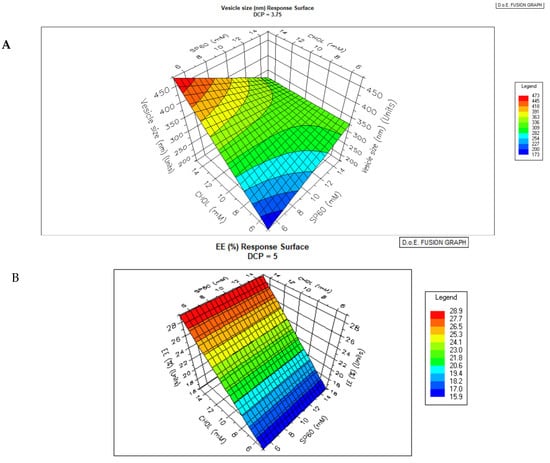 The interrelationship of niosome formers on vesicle size, encapsulation efficiency, and Zeta potential are shown in the response surface graphs in Figure 3A, B, and C, respectively.