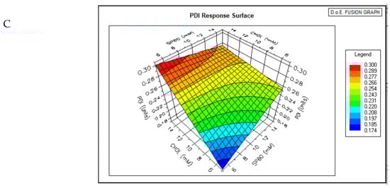 (A) Response surface for the interaction between input variables and their impact on (A) niosome drug encapsulation. (B) Response surface for the interaction between input variables and their impact on vesicle (niosome) size. (C) Response surface for the interaction between input variables and their impact on polydispersity index (PDI). Legend represents vesicle size, EE or PDI respectively.