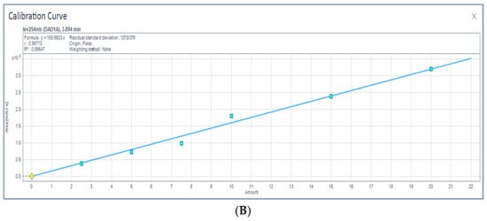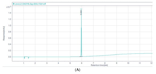 The calibration samples of levofloxacin at different concentrations were prepared and analyzed on HPLC using parameters described in Section 2.3.2. The chromatogram obtained using a mobile phase of water: acetonitrile (+0.75% trifluoro acetic acid, TFA) in gradient mode sowed levofloxacin elution at an average retention time of 5.8 (±0.047) minutes (Figure 4A). The peak area obtained for each sample was plotted against the respective concentration (Figure 4B). The equation of the line (Equation (1)) obtained from the calibration curve was as follows:
