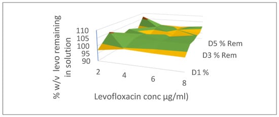 Niosomes were prepared following the previously reported and optimized formulation comprising cholesterol, sorbitan monostearate (Span 60), and dihexadecyl phosphate (dicetylphosphate) in the molar ratio of 9.5:9.5:1, respectively, using the thin film hydration method [22,23]. Niosomes containing levofloxacin were prepared using surfactant (Span 60), cholesterol, and dicetylphosphate in varying molar ratios determined by Design of Experiment (DoE Fusion One software). The layout of factor combinations is shown in Table 1. The thin film hydration and post-preparation handling procedures, previously reported in our lab [3,22], were used. Hydrated pro-niosomes were ultra-sonicated for 6 min using a 20% amplification setting at 25 °C. The resulting colloidal dispersion was washed twice with phosphate-buffered saline and lyophilized. The lyophilized powder was stored in an air-tight, light-protective vial until used for further experimentation.