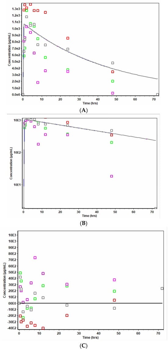 (A) Cp vs. t for levofloxacin niosomes. Each colored box represents a Cp vs. time profile of an animal; lines represent lines of best fit. (B) log Cp vs. t for levofloxacin niosomes. Each colored box represents a Cp vs. time profile of an animal; lines represent lines of best fit. (C) Plot of residuals for levofloxacin niosomes. Each colored box represents residuals for a Cp vs. time profile of an animal; lines represent lines of best fit.