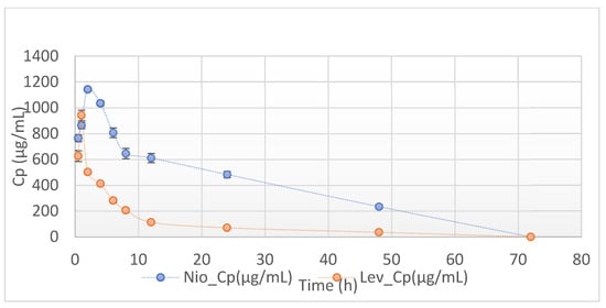 Average Cp vs. times for rats administered levofloxacin niosomes and those with pure levofloxacin.