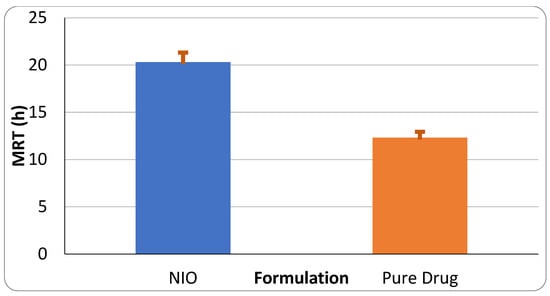 Non-compartmental PK parameters are useful for predicting biodisposition patterns of drug molecules from delivery systems into and outside of the biological system. The area under the concentration versus time plot (AUC) is an indication of the rate and extent of drug exposure to the body. AUMC is the area under the first moment curve. It is obtained as the product of concentration and the time it was obtained. When AUMC is divided by the AUC, the mean residence time (MRT) is obtained. MRT is an index of how long the drug molecule stays at different sites in the body. As shown in Table 7, AUC, AUMC, and MRT values are higher for niosomes than for levofloxacin. The comparative values of MRT is also shown in Figure 10. Conversely, the rate of removal of drugs from the body (clearance, Cl) is slower for niosomes than for the pure drug, indicating the ability of niosomes to sustain the intravascular residence of the embedded drug.