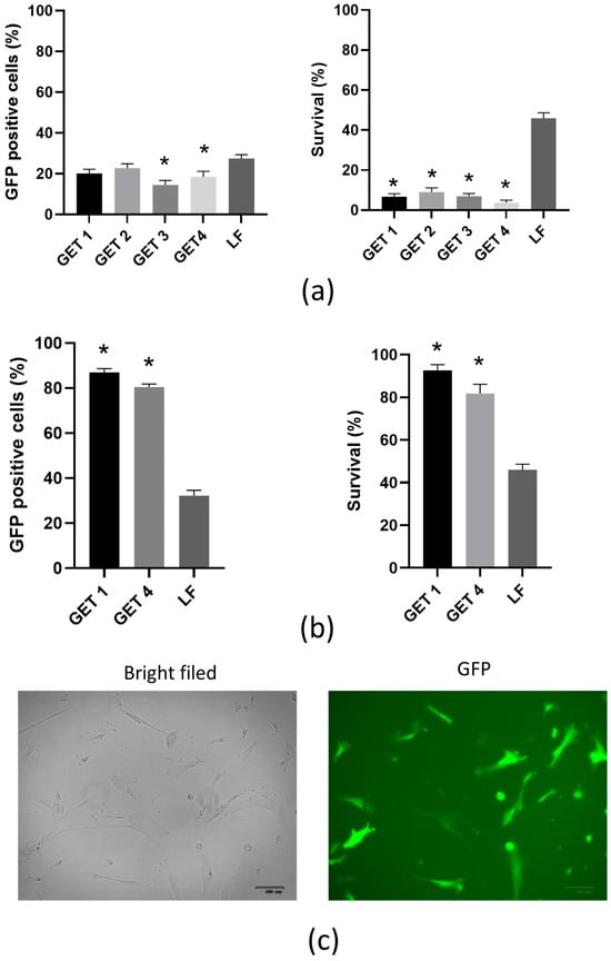 Validation of MSC electroporation protocol. (a) Initial testing using four different GET pulses. (b) Modified protocol under room temperature conditions using selected GET pulses. (c) Fluorescence microscopy image of transfected cells. GET 1 = 8 × 1300 V/cm (260 V/2 mm), 100 µs, 1 Hz; GET 2 = 8 × 1300 V/cm (260 V/2 mm), 100 µs, 4 Hz; GET 3 = 8 × 1300 V/cm (260 V/2 mm), 100 µs, 5000 Hz; GET 4 = 8 × 600 V/cm (120 V/2 mm), 5000 µs, 1 Hz; LF = Lipofection (Lipofectamine 2000); GET, gene electrotransfer; GFP, green fluorescent protein. Results are presented as means of three independent experiments with three replicates ± SEM. Statistical significance: * p ≤ 0.05 vs. lipofection group. Scale bar: 100 µm.