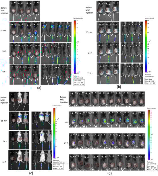 Non-invasive bioluminescence imaging was used to visualize the distribution of luciferase transfected MSCs after intravenous and intratumoral injection. When the tumors reached an average volume of 50 mm3 (6–7 mm diameter), the mice were randomly divided into different treatment groups with 3–6 animals per group. Luciferase transfection was performed as described. Two days after transfection, the cells were resuspended in 0.9% NaCl. Part of the transfected cells were plated on a black 96-well plate (Greiner Bio-One) to confirm transfection efficiency and determine cell luminescence using the IVIS Lumina XRMS Series III optical imaging system (Revvity, Waltham, MA, USA) (Supplementary Figure S2). The rest of the cells were resuspended to concentration of 2 × 107 cells/mL for intravenous injection and 0.5 × 107 cells/mL for intratumoral injection. Intravenous injection was performed by a tail vein injection of 100 µL of cell suspension containing 2 × 106 of cells using polyethylene tubing and a 29G insulin syringe. To ensure the successful intravenous injection of MSCs and minimize technical errors, we implemented a two-step procedure. First, we confirmed the injection pathway using physiological saline as described in our previously published protocol []. Intratumoral injection was performed by injection of 100 µL of cell suspension containing 0.5 × 106 cells directly into the tumor tissue using 29G insulin syringe. The luminescence signal was recorded 15 min after injection of the MSCs and then every day until the signal disappeared using the IVIS Lumina XRMS Series III optical imaging system. At each time point, the bioluminescence signal was measured 15 min after the intraperitoneal injection of 150 µg/g mouse weight of endotoxin-free D-luciferin potassium salt (GoldBio, St Louis, MO, USA) in Endotoxin-Free Dulbecco’s PBS without Ca2+ & Mg2+ (Sigma Aldrich, St Louis, MO, USA). After intravenous injection, the mice were imaged from both the dorsal and ventral sides.