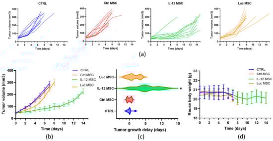 Therapeutic efficacy of IL-12-transfected MSCs: (a) Tumor growth curves for individual mice. (b) Average tumor growth curves drawn as mean tumor volume with standard error of mean (c) Tumor growth delay (difference between tumor doubling times in control and therapeutic groups) drawn as violin plot with mean. (d) Average mice body weight drawn as mean body weight with standard error of the mean. CTRL = untreated tumor-bearing mice, Ctrl MSC = mice treated with intratumoral injection of non-modified MSCs; IL-12 MSC = mice treated with intratumoral injection of IL-12-transfected MSCs: Luc MSC = mice treated with intratumoral injection of Luc-transfected MSCs. Two independent experiments with 5 animals per group. Statistical significance: * p ≤ 0.05 vs. all groups.