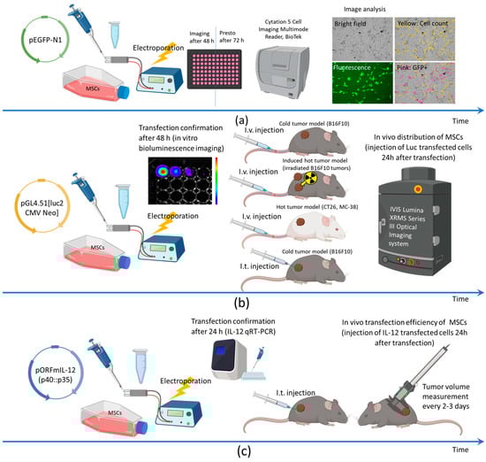 For the in vivo MSCs tracking, MSCs were transfected with luciferase reporter plasmid pGL4.51[luc2 CMV Neo] and for therapeutic efficiency study with the IL-12 plasmid pORFmIL-12 (p40::p35). GET 1 pulses and room temperature conditions were used for the transfection. After electroporation, the cells were transferred to culture flasks and incubated at 37 °C in a humidified incubator with 5% CO2.