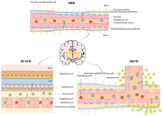 Central nervous system (CNS) diseases encompass diverse conditions, including brain tumors, neurodegenerative disorders (e.g., Alzheimer’s and Parkinson’s diseases), cerebrovascular diseases (e.g., stroke), and neuropsychiatric disorders (e.g., depression and epilepsy) []. These conditions are among the leading causes of disability and mortality globally. These diseases not only diminish the quality of life for affected individuals but also impose considerable economic burdens on society and healthcare systems [,]. Despite significant advancements in modern medicine, the effective delivery of many therapeutic drugs is still significantly impeded by barriers like the blood–brain barrier (BBB), blood–cerebrospinal fluid barrier (BCSFB) and blood–brain tumor barrier (BBTB) [].