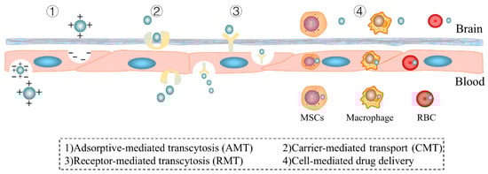 Primary pathways for Trojan Horse strategy delivery across the blood–brain barrier. The diagram illustrates four principal delivery mechanisms employed in the Trojan Horse approach: (1) adsorptive-mediated transcytosis (AMT), which involves the electrostatic interaction between positively charged molecules and the negatively charged endothelial cell surface; (2) carrier-mediated transport (CMT), which utilizes specific transport proteins to facilitate the passage of small molecules across the barrier; (3) receptor-mediated transcytosis (RMT), which exploits specific receptors on the endothelial surface to transport larger molecules or complexes; and (4) cell-mediated drug delivery, which involves the use of cells such as mesenchymal stem cells (MSCs), red blood cells (RBCs), or macrophages to transport therapeutic agents across the barrier.