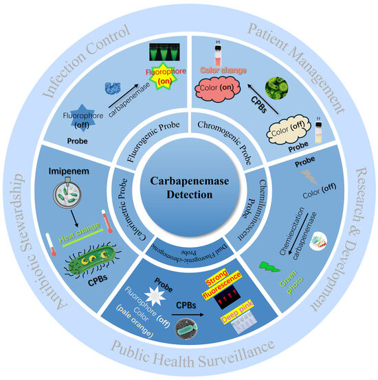 Schematic illustration of small-molecule probes in carbapenemase detection and their applications.