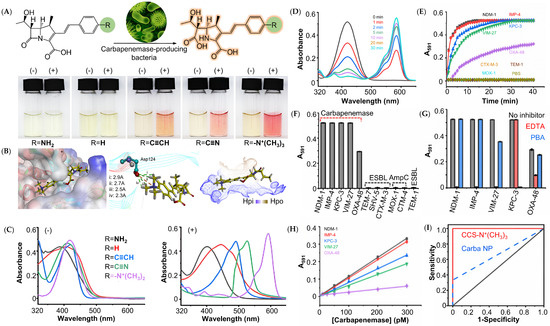 (A) Schematic representation of the cleavage of the β-lactam ring of CCS with different R substituent groups by carbapenemase and their color changes after incubation with NDM-1. (B) The electrostatic force, van der Waals force, hydrogen bonds, and hydrophobic interaction between CCSs and NDM-1 (“+”: electrostatic surface potentials). (C) The UV/Vis spectra of CCSs after incubation with NDM-1. (D) The UV/Vis spectra of CCS-N+(CH3)3 after incubation with NDM-1 for 30 min. (E) Time-dependent absorbance changes at 591 nm of CCS-N+(CH3)3 after incubation with carbapenemases and non-carbapenemases. (F) A591 of CCS-N+(CH3)3 after incubation with a range of β-lactamases. (G) A591 of CCS-N+(CH3)3 after incubation with five carbapenemases with and without the presence of inhibitors. (H) A591 of CCS-N+(CH3)3 after incubation with five carbapenemases in a concentration-dependent manner. (I) The Receiver Operating Characteristic (ROC) Curve of the Carba NP test and CCS-N+(CH3)3-based POC method. Adapted with permission from ref. [25]. Copyright 2022, American Chemical Society.