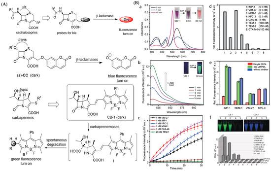 However, most β-lactamase probes based on cephalosporin were relatively unstable and readily hydrolyzed by common β-lactamases in clinical settings. Therefore, another study, led by Xie and his team, developed a carbapenem-derived fluorogenic probe, CB-1, to directly enhance the specificity of carbapenemase detection [33]. Fluorogenic probes can be easily degraded, or they undergo quick photobleaching due to their unique chemical structure. However, CB-1 was relatively more stable than previous cephalosporin-based probes. They chose an alkenyl-linked boron dipyrromethene dye (BODIPY) as the fluorophore, which remained non-fluorescent initially. A carbapenem core was conjugated with BODIPY, and when the core structure was hydrolyzed by carbapenemase, the probe would generate the labile dienamine I, which underwent further spontaneous isomerization or degradation processes that disrupted the conjugation between carbapenem and BODIPY, leading to a strong green fluorescence signal, which demonstrated an impressive selectivity toward carbapenemases (limited concentration of 100 nM) over other prevalent β-lactamases (Figure 5A). Notable spectral shifts were seen against IMP-1 (Figure 5B(a,b)), and distinct fluorescence intensity was obtained among carbapenemases rather than other β-lactamases (Figure 5B(c,d)). Its specificity was validated through the inhibitory test (Figure 5B(e)), though CDC-1 seemed more sensitive in detecting the OXA-48 type of carbapenemase than CB-1 (Figure 5B(f)). Additionally, CB-1 showed exact results in carbapenemase-producing organisms (CPOs) screening that distinguished the CPOs from other antibiotic-resistant bacteria as expected.
