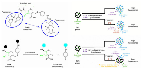 - Mao, W.; Wang, Y.; Qian, X.; Xia, L.; Xie, H. A Carbapenem-Based Off-On Fluorescent Probe for Specific Detection of Metallo-β-Lactamase Activities. ChemBioChem 2019, 20, 511–515. [Google Scholar] [CrossRef] [PubMed]