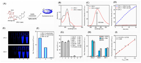 Ambler B β-lactamases are a type of carbapenemases that depend on metal ions, including IMP, VIM, and NDM-β-lactamases. Xie et al. chose umbelliferone as the activatable fluorophore and adopted carbapenem as the enzyme recognition moiety to construct CPC-1, a carbapenemase-specific fluorogenic probe. The probe could be activated by carbapenemases, typically MBLs, to turn on fluorescence from umbelliferone (Figure 7A) [35]. CPC-1 demonstrated good chemical stability in phosphate-buffered saline (PBS), with a relatively slow spontaneous hydrolysis rate of 2.5 × 10−6 s−1, giving it an estimated half-life of around 78 h. The hydrolysis of carbapenemases to CPC-1 and the fluorescence spectrum of CPC-1 were confirmed using VIM-27 as an example (Figure 7B,C). Upon incubation with a series of different types of β-lactamases, CPC-1 showed a quick and significant fluorescence signal (>200-fold) with MBLs (VIM-27, NDM-1, and IMP-1) in a concentration-dependent manner, while others (TEM-1, KPC-3, OXA-48, and CTX-M-9) exhibited poor or no signals, indicating high specificity toward MBLs. Hydrolysis of CPC-1 by MBLs was further proved by incubating with and without inhibitors (Figure 7D–I).