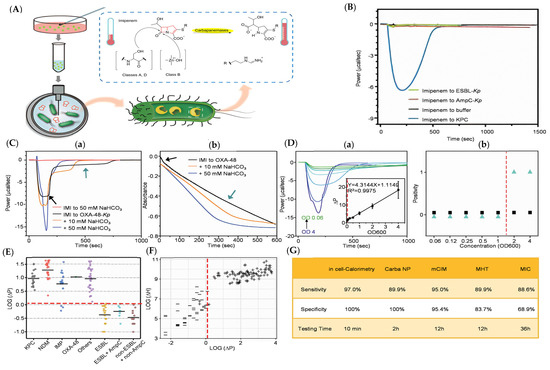 Fluorogenic probes and chromogenic probes were designed to avoid signal interference, which is potentially caused by certain bacteria substrates or turbid bacterial suspension in spectrometry, LC-MS/MS, and MALDI-TOF MS, and they have resolved the inability to monitor real-time hydrolysis reactions [33]. However, the change in kinetic properties and the specificity of labeled substrates when encountering complex biological systems were unpredictable. Therefore, a novel method to detect carbapenemase by label-free natural substrates was utilized to observe enzyme activity in real-time [39]. Although hardly seen, monitoring the real-time heat change in biochemical reactions provided more precise and important data compared with traditional kinetic methods (Figure 10A) [40]. The researchers proved that the enthalpy and efficiency of β-lactam ring cleavage were distinguished significantly from background heat changes to guarantee the feasibility of the calorimetric method. Imipenem was chosen with and without the presence of carbapenemase inhibitors to confirm the enzymatic hydrolysis of carbapenem over time in living bacteria, the result of which was reflected by the heat change curve seen in Figure 10B. Surprisingly, a biphasic exothermic curve, which involved a quick exothermic surge and a slow exothermic decline, was observed in OXA-48-Kp, and this could be attributed to the carbamylation of a conserved lysine in some OXAs, formed by the reaction of carbon dioxide and the non-protonated ε-amino group of the lysine [41,42,43]. However, the effect of the biphase was imperceptible in UV assay, indicating the high sensitivity of the calorimetric approach and its potential to identify OXA carbapenemases (Figure 10C). A linear relationship was observed between bacterial concentration and heat change (ΔP), and the minimum detectable concentration of this method was much lower than that of the Carba NP test (Figure 10D). In direct comparison with the Carba NP test, the intracellular calorimetric test not only showed an extraordinary ability to generate real-time thermograms for OXA but also displayed at least two orders of magnitude more sensitivity in less than 10 min. In a small-scale screening test for CPE, a collection of 142 clinical Enterobacteriaceae isolates was included to assess the performance of the method, the result of which was 97% for sensitivity and 100% for specificity, while other assays, including Carba NP, mCIM, MHT, and MIC, all showed poorer results with longer testing times (Figure 10E–G). The only three false negative samples were IMP-1, IMP-4, and an unknown IMP-producing one, which all had low enzyme expressions. This natural substrate-based label-free method through imipenem catalysis was proven to be a simple, effective, and reliable tool to rapidly screen patients infected with CPB, and it also tracked the footprint and provided real-time information on the activity of all types of in-cell carbapenemase, including OXA-48-like carbapenemase. Even though they had applied carbapenem hydrolysis as an example of using heat change to reveal chemical reactions in living microbes, the idea was rather basic and was deemed relevant to a wide range of areas far beyond its immediate applications, which required a description of enzymatic activity in complex natural systems such as autoimmune cell reactions, tumor cell growth, and so on.