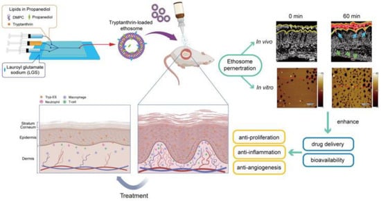 Corticosteroids, as first-line topical treatments for psoriasis, can cause damage to normal skin, such as inducing epidermal and dermal atrophy. To avoid the aforementioned issues, Mai et al. designed bioadhesive nanoparticles (BNPs) modified with Tris which are loaded with corticosteroids. Briefly, the NNPs were prepared through the self-assembly of polylactic acid-hyperbranched polyglycerol (PLA-HPG) and loads drugs into the hydrophobic core of copolymer, then BNPs were obtained through the incubation of NNPs with NaIO4. At last, Tris-BNPs were further obtained by diluting the BNPs suspension with the Tris solution. Tris-BNP does not inhibit adhesive properties due to Tris modification and therefore does not harm normal skin. When the nanoparticles penetrate the psoriatic lesion skin, Tris slowly diffuses, and the aldehyde groups on BNP gradually expose and bind with the amine groups in the lesion skin, maintaining long-term topical retention. In this case, corticosteroids can be released in a slow and sustained manner, maintaining a high topical concentration. In the evaluation of psoriasis treatment, compared with commercially available products (Betamethasone Dipropionate Ointment USP, 0.05%), Tris-BNP significantly improved PASI scores and reduced skin damage and hyperproliferation [89]. Cyclosporine (CsA) and Dithranol (DTH), classified as BCS class II drugs, are also used to treat psoriasis but still face the problem of low bioavailability. Elhabal et al. developed a niosomal drug delivery system cerosomes-based on ceramide IIIB, using a thin-film hydration technique to deliver CsA and DTH. These CsA-DTH cerosomes enhanced the solubility and bioavailability of these two insoluble drugs, exhibited greater stability, and facilitated penetration into the skin via ceramide IIIB, while also contributing to the repair of the damaged skin barrier. The average size of the ceramide/phospholipid composite cerosomes is 222.36 nm. Compared with the CsA/DTH solution, the CsA-DTH cerosomes increased the skin permeability of the two drugs by 66.7%, and reduced the PASI score by 2.73 times and 42.85%, respectively [90]. In addition to the two types of nanocarriers mentioned above, ethosomes, as novel phospholipid-based vesicles containing high levels of ethanol, have made significant progress in other skin diseases. In this paper, propylene glycol was used to improve the safety of ethosomes, and sodium lauroyl glutamate was used to regulate their stability and deformability (Figure 3). Tryptanthrin (Tryp), which can alleviate imiquimod (IMQ)-induced psoriatic mice by suppressing inflammation and oxidative stress, was encapsulated by this ethosomal drug delivery nanovesicle to improve the solubility and dispersibility. The optimal nanovesicles were obtained through microfluidic technology and formulation screening, with a stable particle size of 112 nm [91].