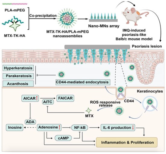 - Zhou, Y.; Yang, L.; Lyu, Y.; Wu, D.; Zhu, Y.; Li, J.; Jiang, D.; Xin, X.; Yin, L. Topical Delivery of ROS-Responsive Methotrexate Prodrug Nanoassemblies by a Dissolvable Microneedle Patch for Psoriasis Therapy. Int. J. Nanomed. 2023, 18, 899–915. [Google Scholar] [CrossRef] [PubMed]